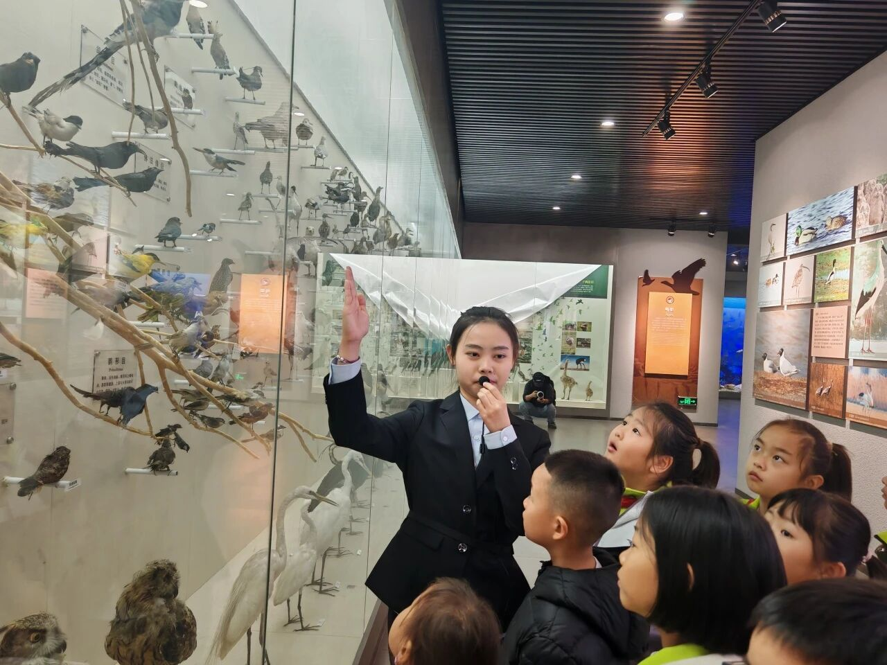 活动伊始,讲解员带领大家有序进入展厅,依次参观了大鸨区、无脊椎动物区、两栖类、爬行类、哺乳类、鸟类、湿地等展区,并以专业的科学知识启发他们的探究思维,向他们讲解动植物标本的制作工艺和这些动植物的生存习性,同时耐心解答他们的疑问,丰富了小学生们的知识体系。参观过程中,小学生们专注聆听,清晰地了解到濒危物种的处境,纷纷表示自己会投身到保护野生动植物的行动中去。