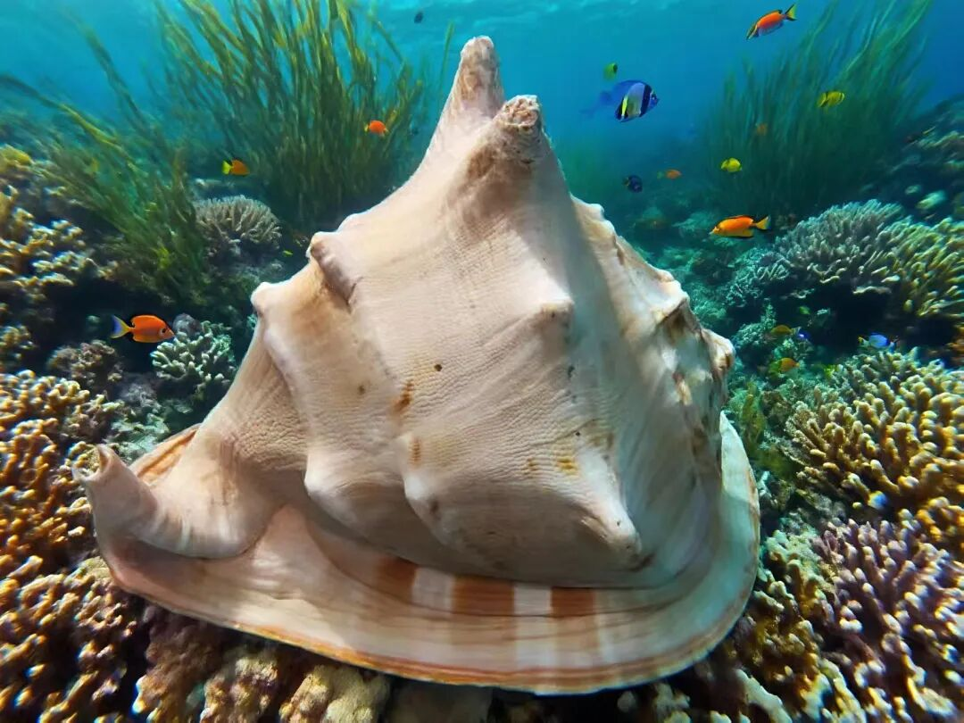 在热带海洋的沙床上,住着一只唐冠螺“小帝”。它的壳长得可威风了——圆圆的像顶倒扣的帽子,表面有一道道凸起的花纹,像给帽子镶了圈金色的花边,活像古代帝王戴的礼帽,因此得名“唐冠螺”。